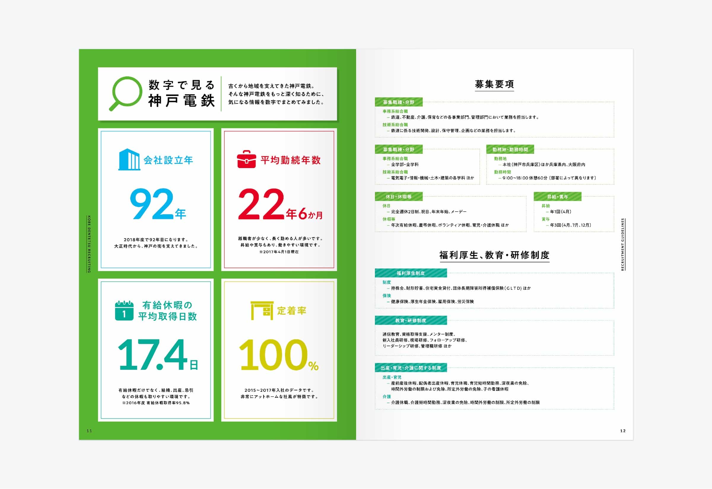 兵庫県神戸市を中心に鉄道路線を運営する神戸電鉄様の採用パンフレットです。 強い個性を持つ学生より、長く安定して働けるような学生を求めていたことから、穏やかなトーンのコピー、デザインで展開しました。 緑色をベースに、イラストと社員の笑顔を多く取り入れながら温かみのあるデザインを目指しました。