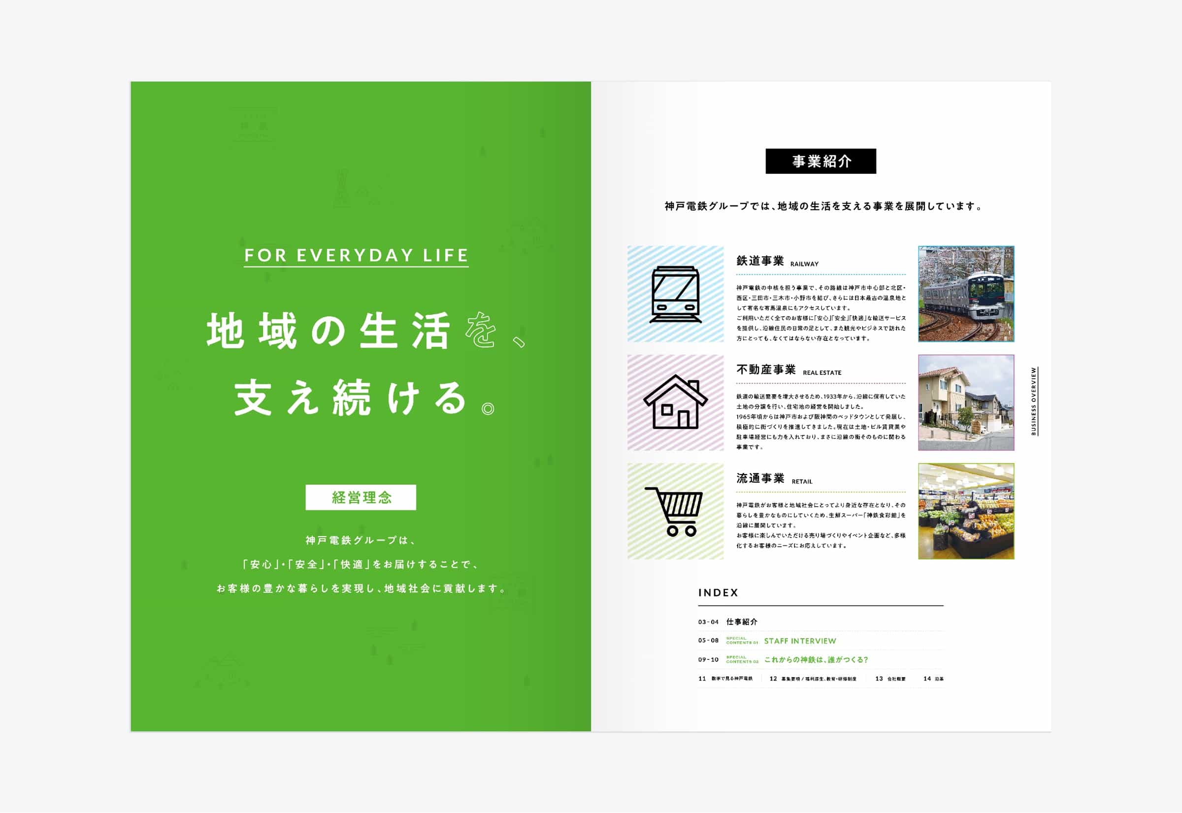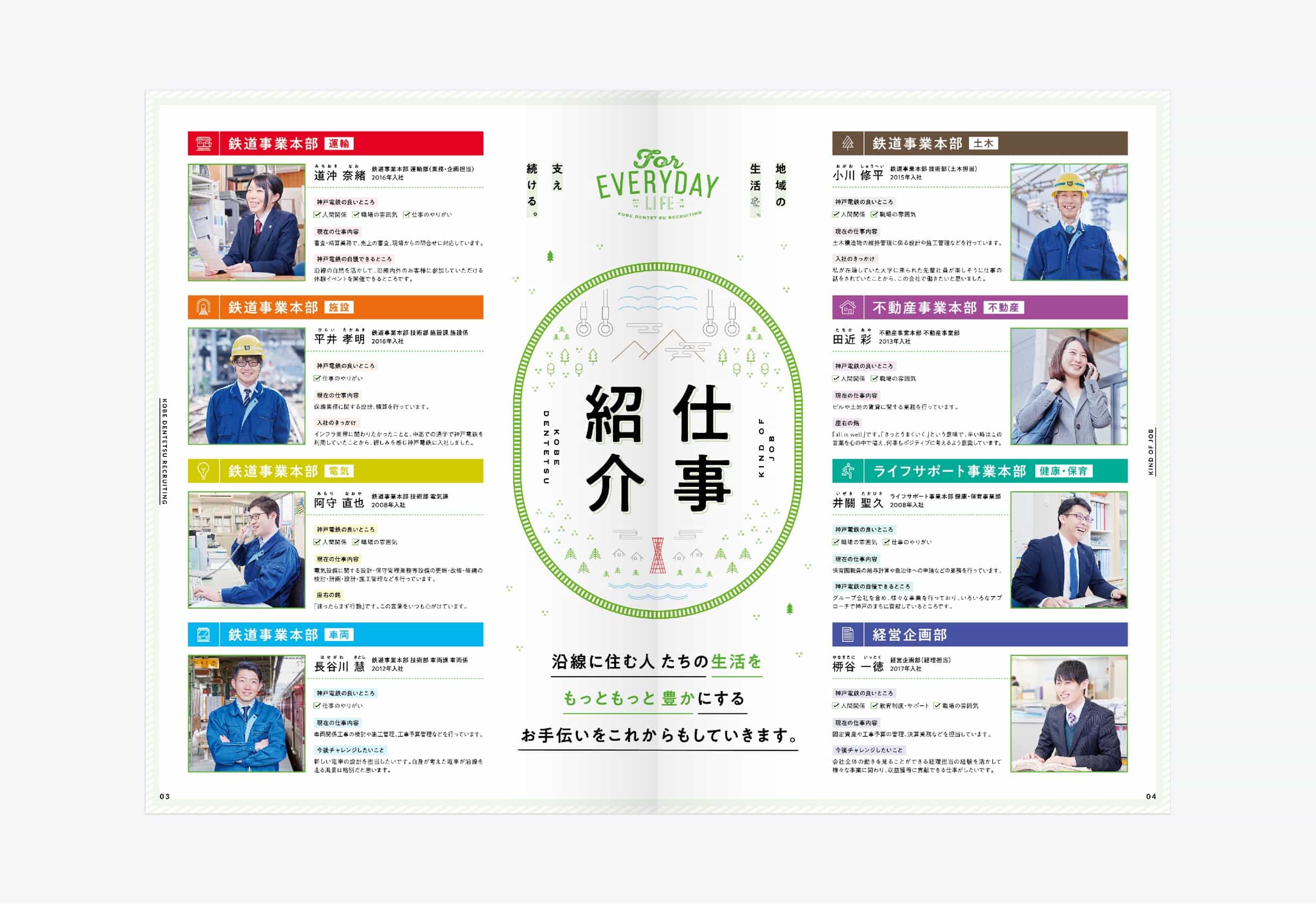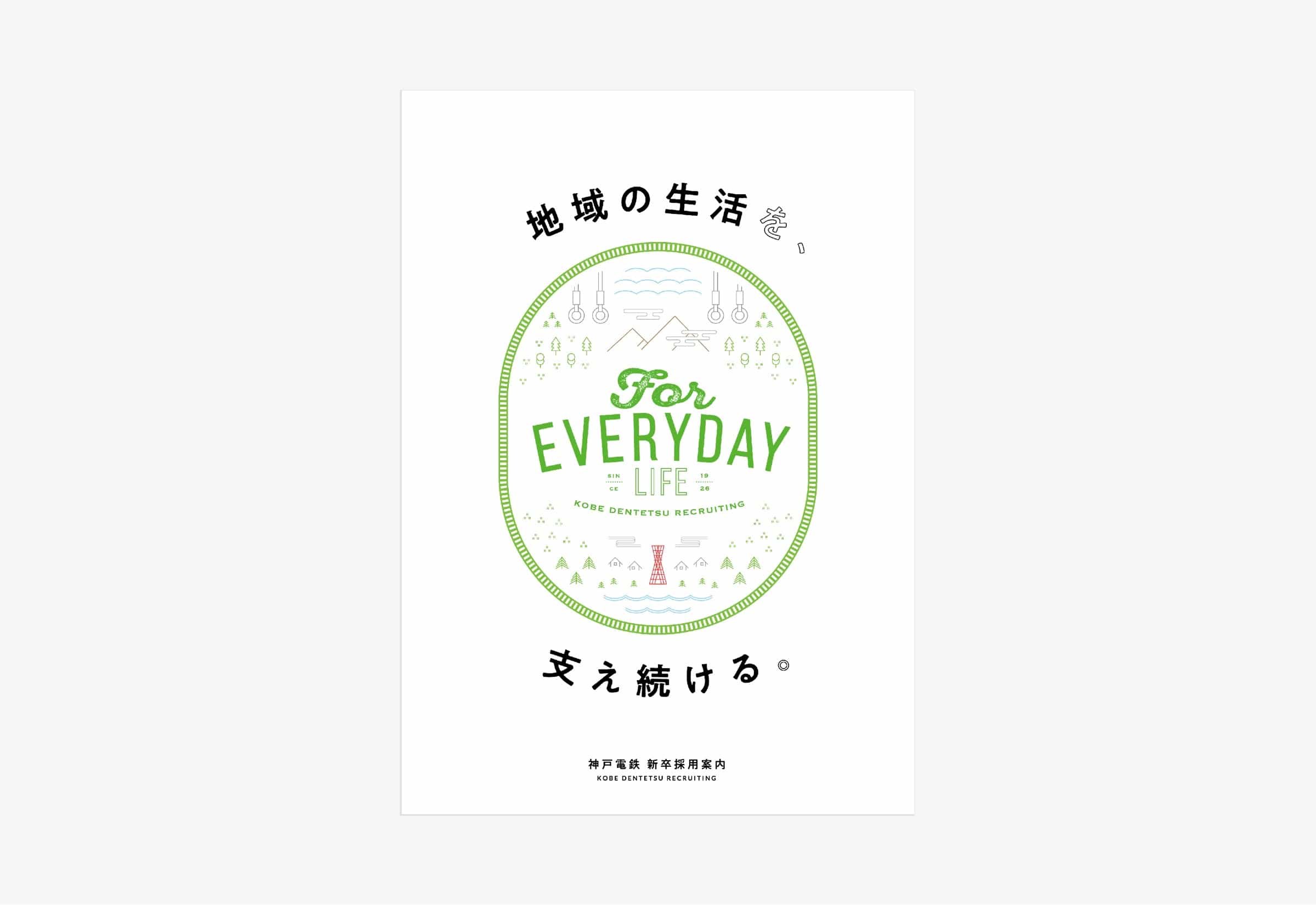 兵庫県神戸市を中心に鉄道路線を運営する神戸電鉄様の採用パンフレットです。 強い個性を持つ学生より、長く安定して働けるような学生を求めていたことから、穏やかなトーンのコピー、デザインで展開しました。 緑色をベースに、イラストと社員の笑顔を多く取り入れながら温かみのあるデザインを目指しました。