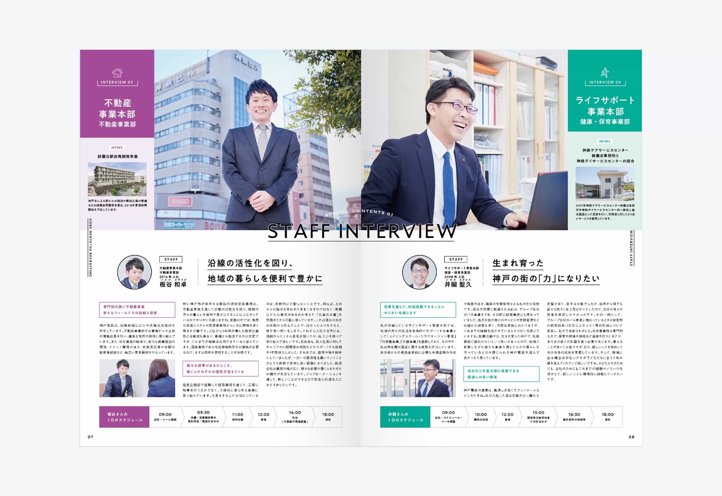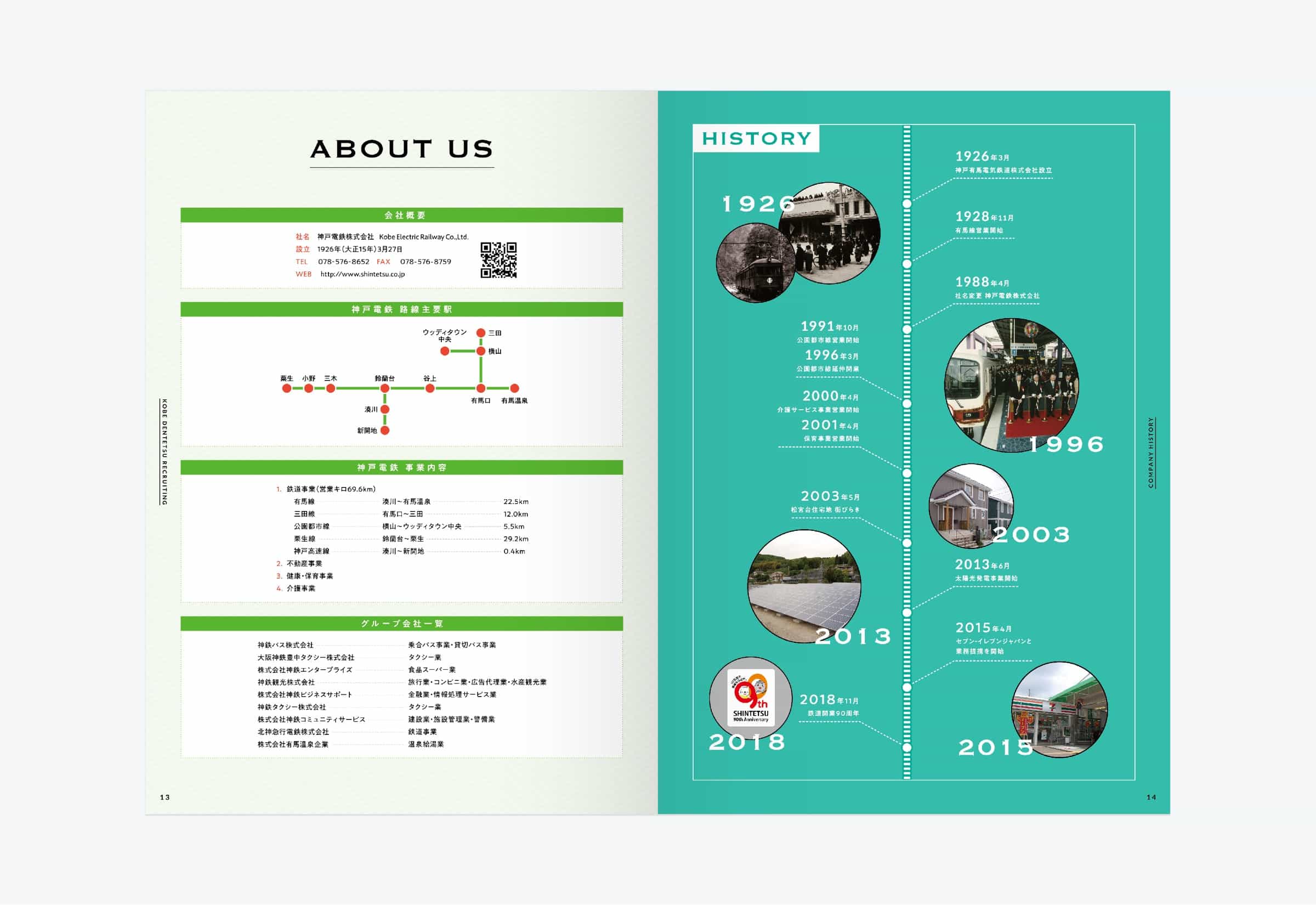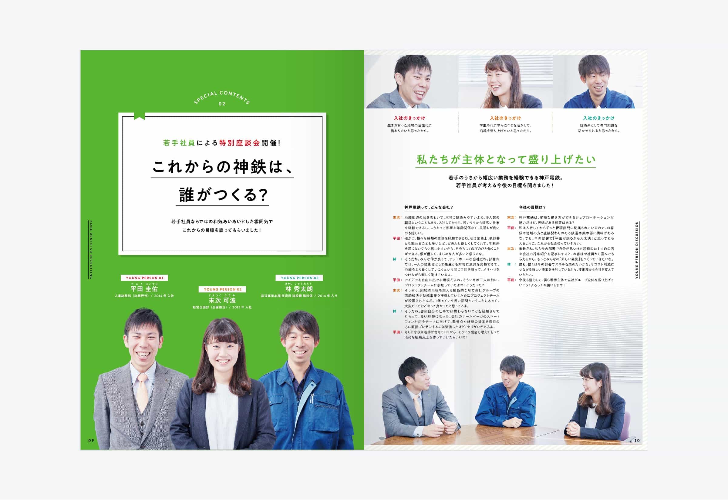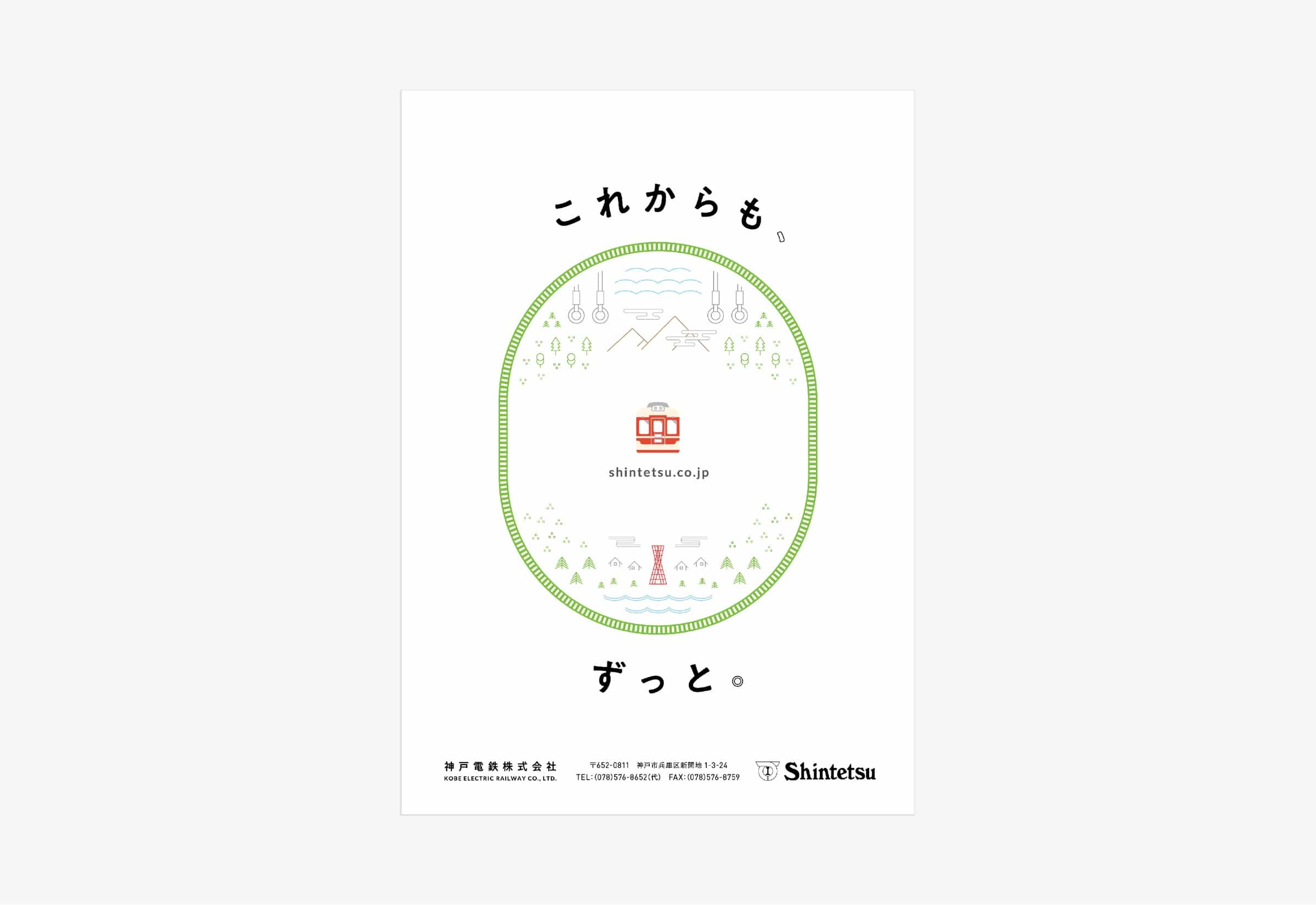 兵庫県神戸市を中心に鉄道路線を運営する神戸電鉄様の採用パンフレットです。 強い個性を持つ学生より、長く安定して働けるような学生を求めていたことから、穏やかなトーンのコピー、デザインで展開しました。 緑色をベースに、イラストと社員の笑顔を多く取り入れながら温かみのあるデザインを目指しました。